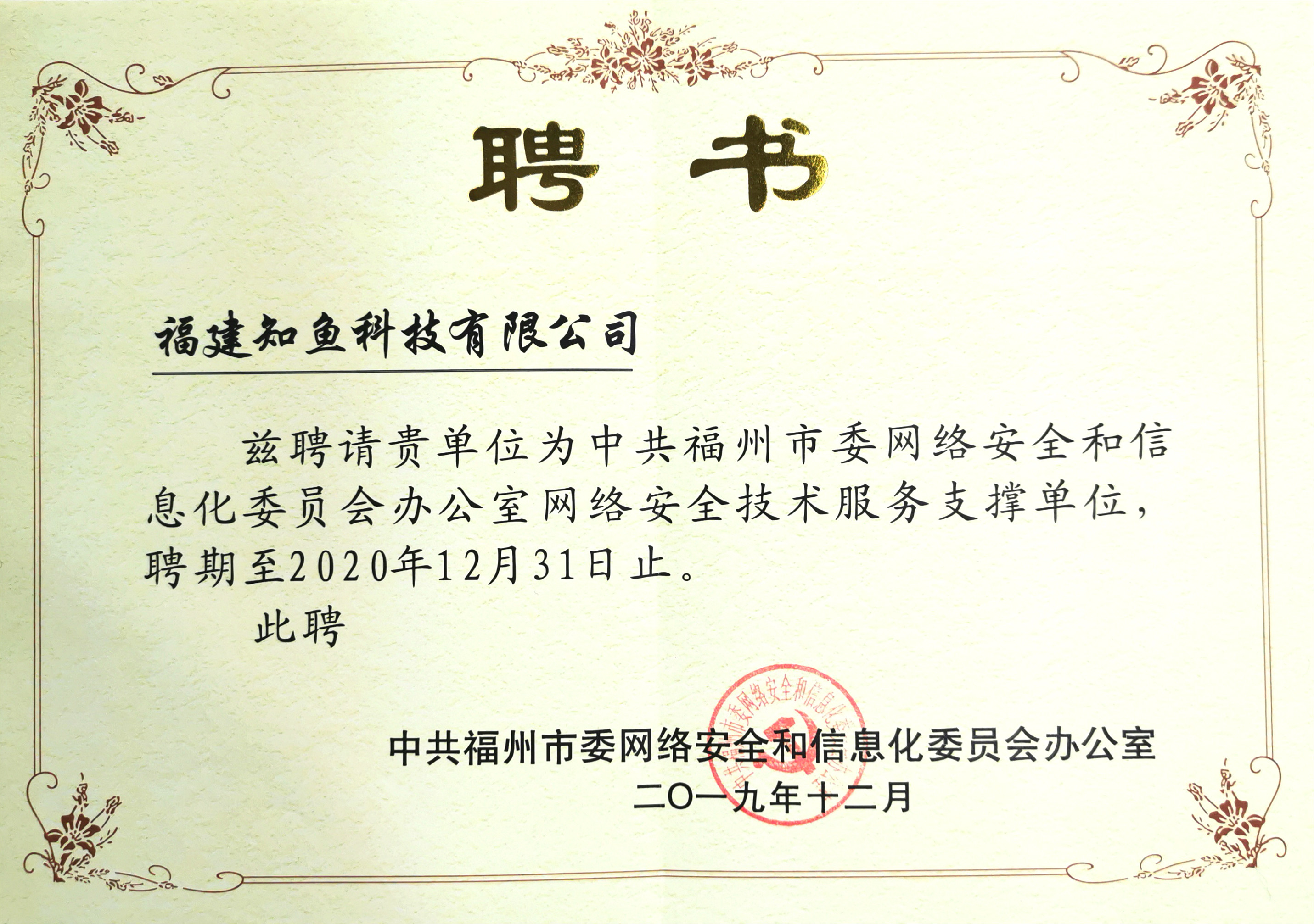 2019年12月,憑借網絡安全領域的技術優勢,知魚科技受聘為福州市委網信辦首批網絡安全技術支撐單位,為全市多領域提供網絡安全測評、網絡空間測繪、入侵檢測、安全防護等在內的網絡安全綜合解決方案,為公共網絡安全保駕護航。